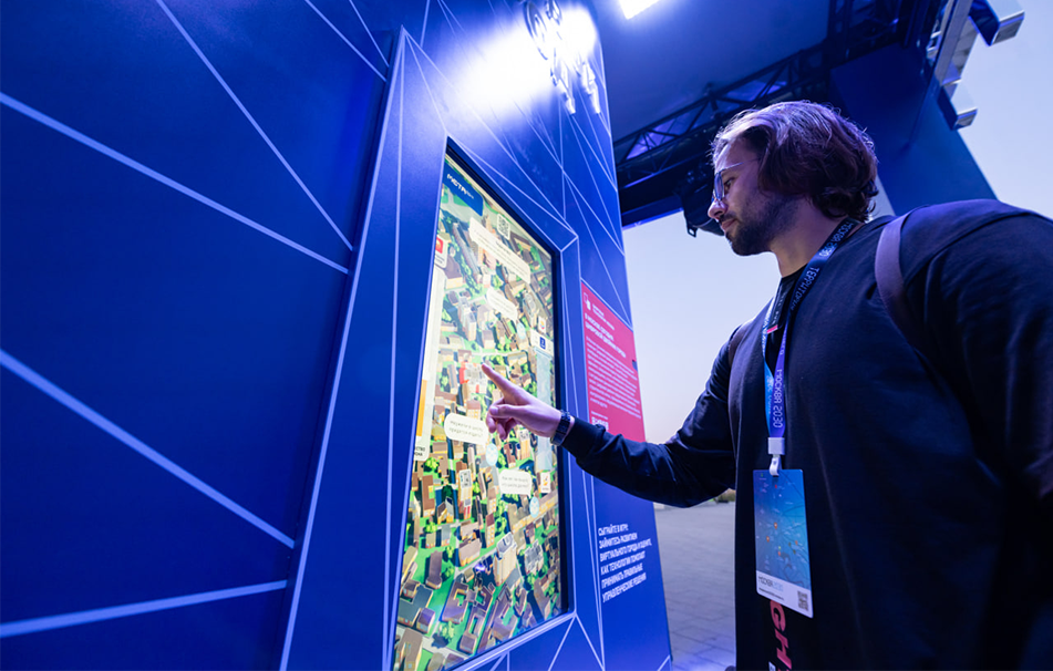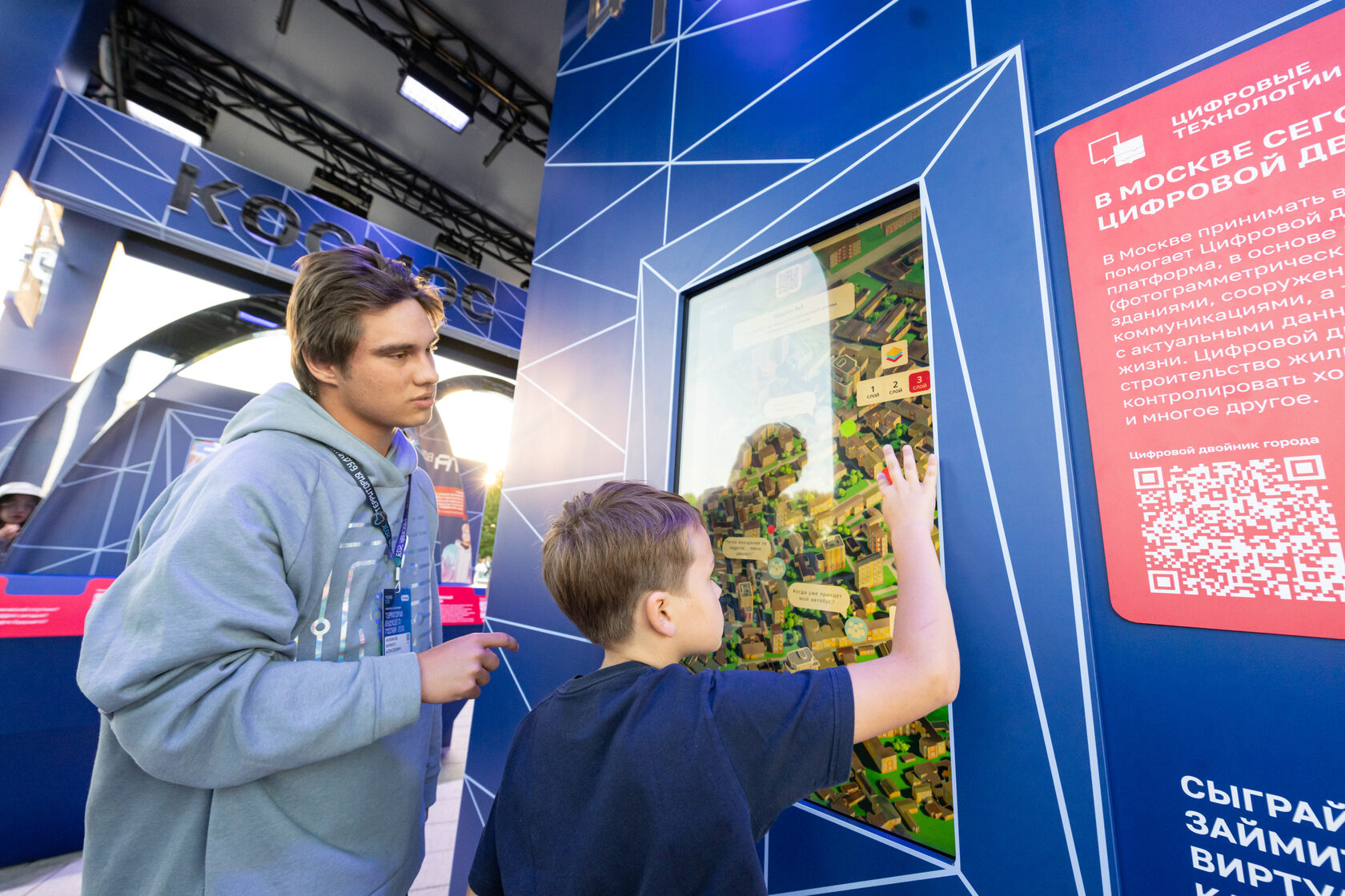 Благодаря нашему симулятору градостроения посетители могут понять принцип работы «Цифрового двойника Москвы». Они должны улучшить один из столичных районов — провести транспортную сеть, построить дома и школы.