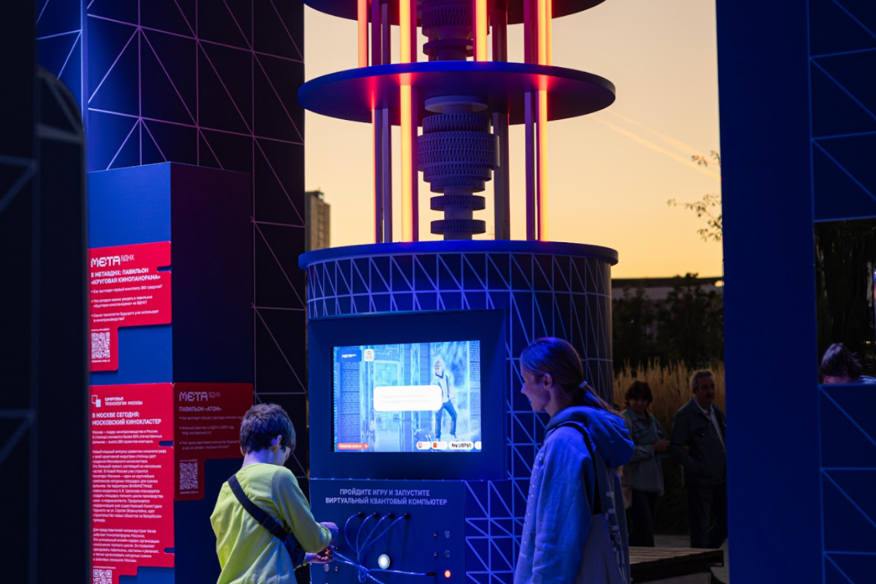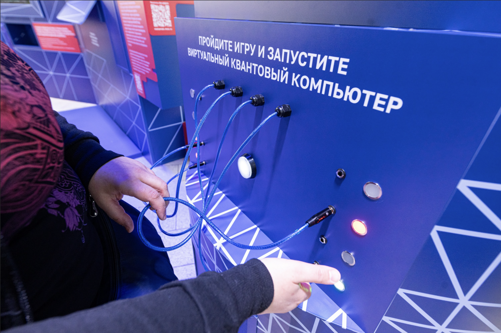 После запуска Ваня Дмитриенко рассказывает посетителям о павильоне “Атом” и о том, где применяется квантовый компьютер.